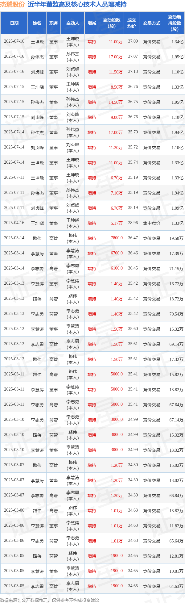 杰瑞股份近半年内的董监高及核心技术人员增减持详情如下: