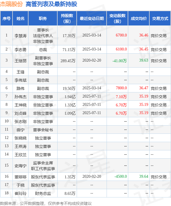 证券之星消息,根据7月17日市场公开信息、上市公司公告及交易所披露数据整理,杰瑞股份(002353)最新董监高及相关人员股份变动情况:2025年7月16日公司董事孙伟杰、董事王坤晓、董事刘贞峰共增持公司股份39.5万股,占公司总股本为0.0385%。变动期间公司股价上涨1.71%,7月16日当日收盘报37.52元。